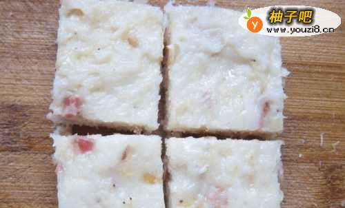 12不粘锅中加入适量油,下入萝卜糕煎至金黄即可。