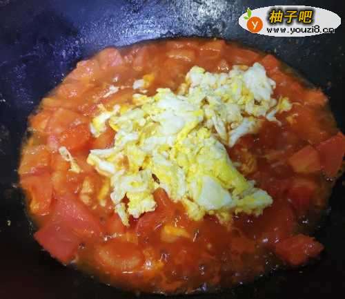 5等番茄汁变少之后,改小火熬制。加入炒好的鸡蛋,继续翻炒,让汁液进一步浓缩,并且沾满鸡蛋。这时候,鸡蛋中有番茄的味道,番茄里有鸡蛋的香味。口感爽滑。