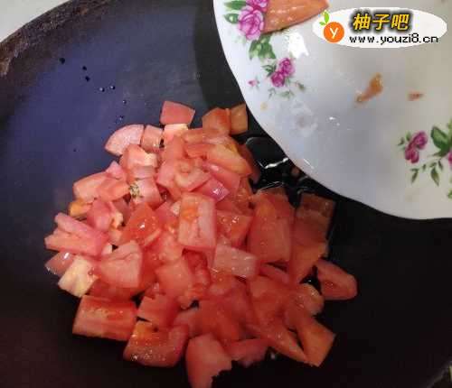 3炒番茄。在炒锅内放入少量油,可以放葱蒜等。我这里没放,直接凉油放入番茄,开始翻炒。这次不会产生油烟。