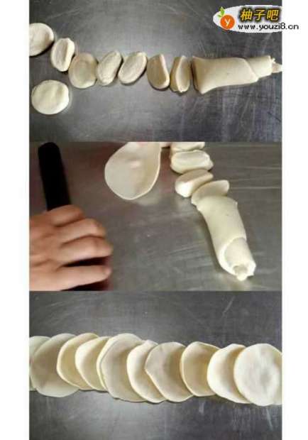 3250g中筋面粉加110g水和成团,搓条下剂,擀面皮。