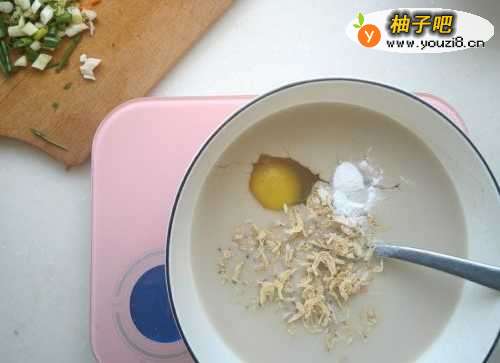 3豆浆碗中加入虾皮,鸡蛋,盐,