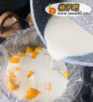 提前在容器里垫上一层保鲜膜,然后倒入芒果块、牛奶混合液体;