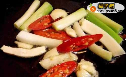 3锅里留下一大匙的油,先爆香葱白、蒜末及辣椒。