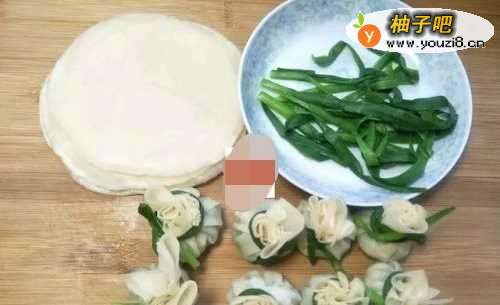 5韭菜提前在开水锅里过一下,然后在凉水里冲凉备用,蒸好的饺子皮,趁热一张一张撕开,取一张包入韭菜豆腐馅,把饺子皮的边缘给拢在一起,用一根韭菜叶扎起来打个结。做成福袋。