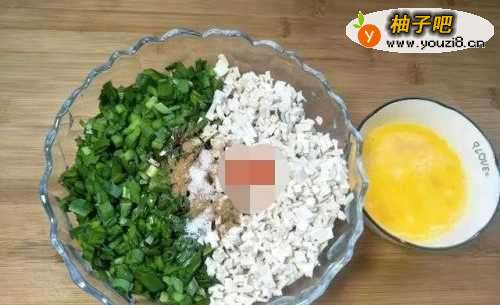 4把韭菜切碎装碗,加盐1勺,1勺五香粉,1勺熟油拌匀,2个鸡蛋加少量盐打散。