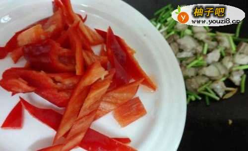 2把蒜苔去头尾洗净切段,红辣椒去籽切小块,姜切丝,蒜切小块