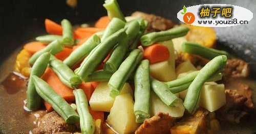 6然后放入胡萝卜、土豆和四季豆,把所有材料翻拌均匀,盖盖继续焖煮20分钟