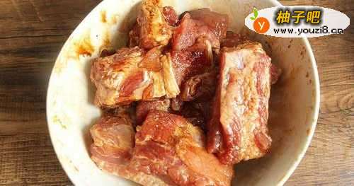 先把排骨剁成段,冲洗干净,沥干水,放入1汤匙的老抽和半汤匙料酒抓匀,放置20分钟