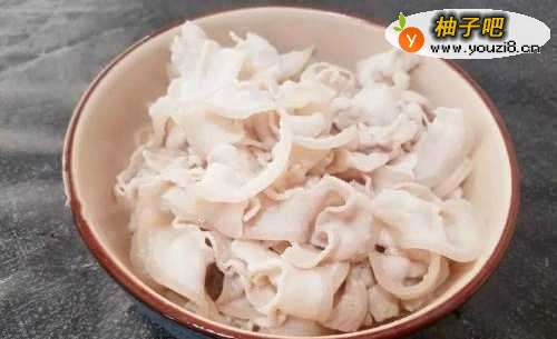 3煮一锅滚水,将猪肉片汆烫至8分熟后捞起备用