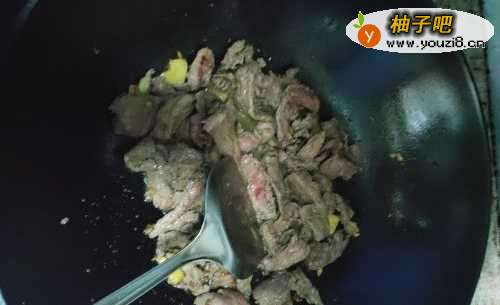 6倒入腌制好的牛肉翻炒,不要太久,以免牛肉炒老了