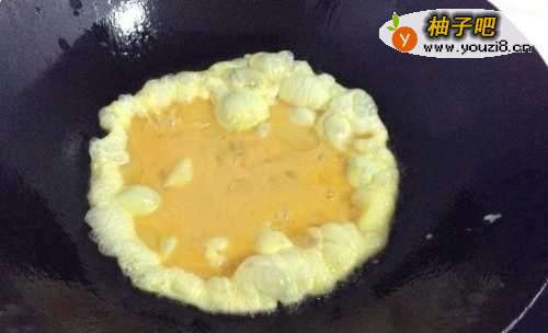 4炒锅中加入少许植物油,油温8成热时,倒入蛋液,不要急着搅拌,要等蛋液成型时再搅拌。