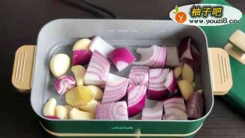 4起锅烧油,加入适量的姜,蒜,洋葱,小火煸炒至颜色发光;