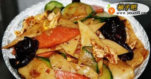 7放入沥干水分的面片,放入酱油和盐翻炒。