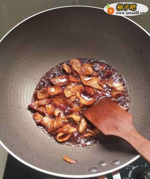 7如图,等把白菜和肉片全部炒熟后放入适量鸡精即可关火。