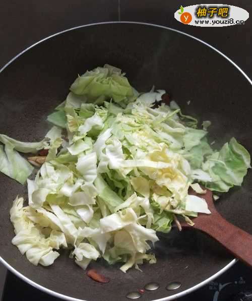 6如图,放入切好的包菜,并将其翻炒均匀。