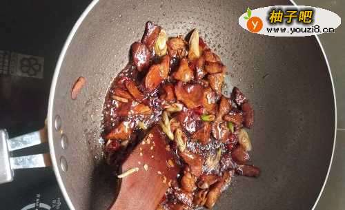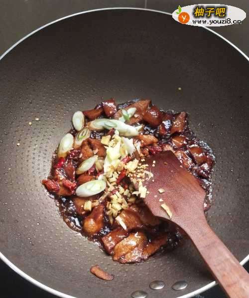 4如图,加入适量酱油将肉片上色,然后再放入大葱、生姜、干红椒,继续翻炒两下。