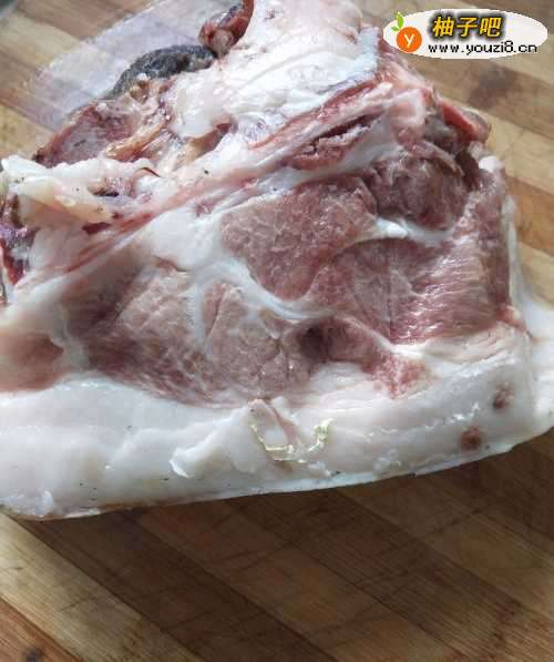 2如图,取来一块猪肉,洗净后切好备用,注意将肥瘦肉分开切,切成均匀的片状。