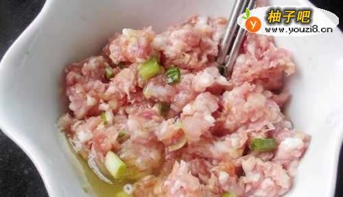 3肉馅放碗中,调入料酒,盐,酱油,白胡椒粉,搅拌均匀;放入葱姜末,继续搅拌,放入一个鸡蛋的蛋清;