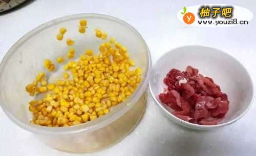 2瘦肉切小条,用盐、生粉腌10-15分钟;玉米粒洗净备用