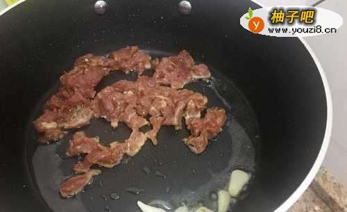 55. 底油烧热,放入肉片炒熟至变色,蒜片爆香。