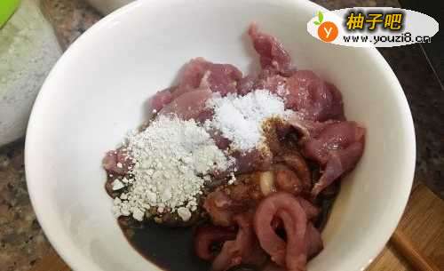 22. 猪肉切片,加1勺生抽、2勺番薯粉、1勺盐,搅拌均匀,最后加入1勺油,腌制10分钟。