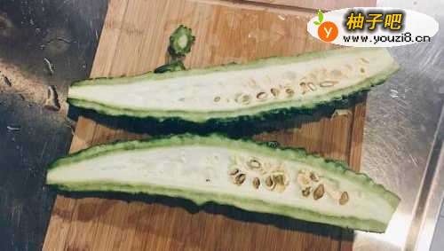 22、苦瓜去头去尾、对半切。
