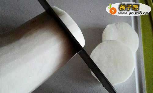 将白萝卜削皮切成约1公分厚的圆片状。