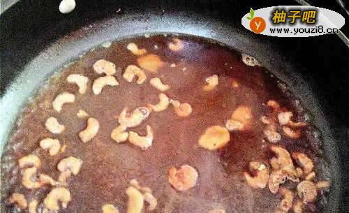 3锅中剩余的油继续爆香虾米及姜片,待香味出来时加入适量酱油炝锅后,加入适量水及调味料、少许白胡椒粉一起调味煮滚。