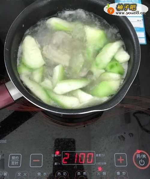 3煮小锅沸水,放油,把猪肉放进去,然后倒入丝瓜,豆腐。