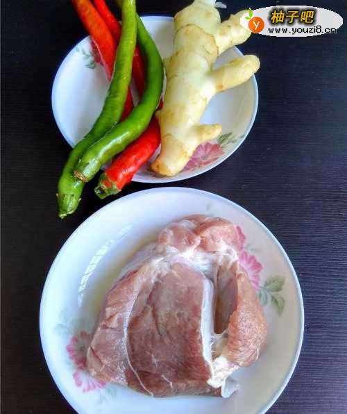 备好原材料:猪肉,仔姜,二荆条,美人椒。