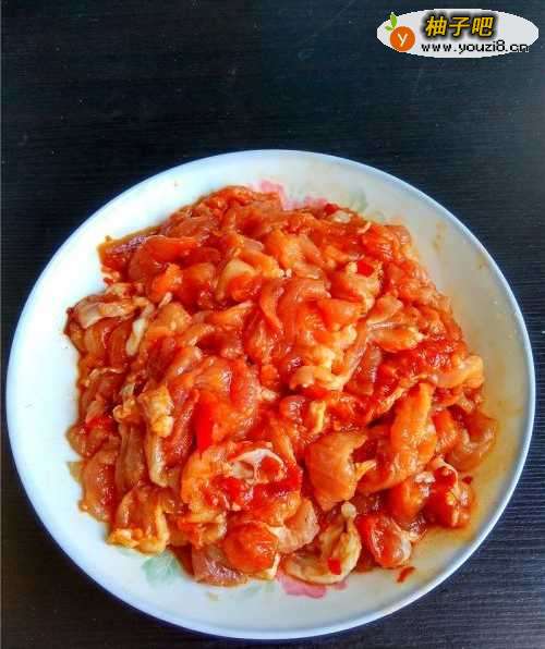 4猪肉切片,调入适量淀粉,郫县豆瓣酱。