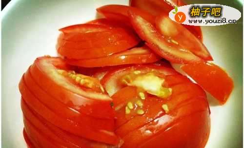 6处理西红柿,将西红柿洗净,对半切开,去除蒂头,然后切成薄片状,也是装盘备用。准备少许生姜,洗净去皮切丝;少许蒜头,拍碎去壳切末;辣椒干,洗净切成小段。