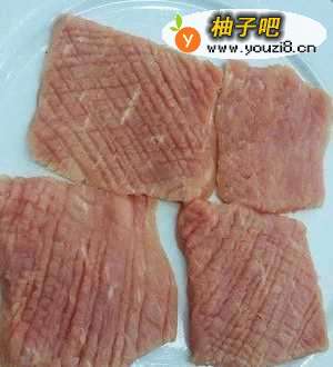 2瘦肉切厚片,两面用刀背排剁留有痕迹即可