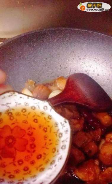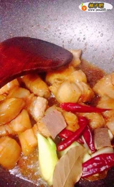 5肉都均匀的裹上糖色后放入以上备好的调料,全部放入,一起翻炒。