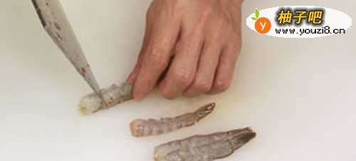 6将洗净的虾去头剥壳,横刀将筋切断。