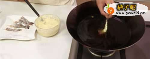 9热锅注油烧至五成热。将静置后的面糊拌匀,虾仁裹上面糊。