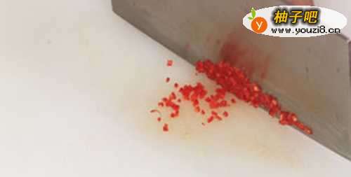 4红椒先切丝后切粒。