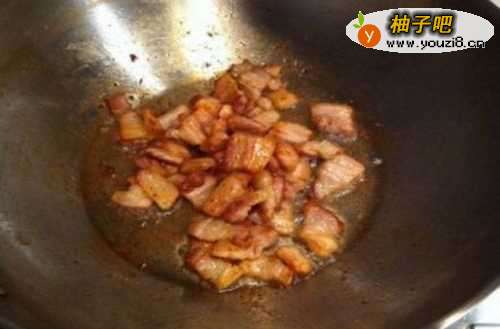 4国内倒入油,开中火加热至油七分热,倒入提前切好的五花肉,开小火慢慢炒出油。