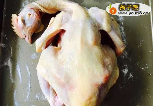 2沥干水分的童子鸡全身抹上盐焗鸡粉,肚子里也要抹上,这样能让肌肉更入味。