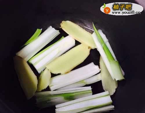 4电饭煲内先倒入少量色拉油,然后摆上大葱和姜片,插上电源。