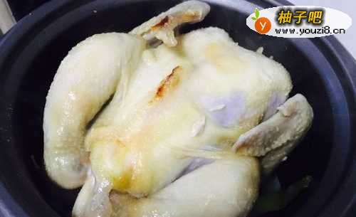 6重复煮饭键两次,把鸡也翻两次面,出锅之前可以用筷子戳一下鸡肉,没有血水则表示盐焗鸡已经熟了。
