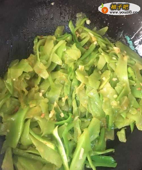 4第四步,锅里留油,放蒜末炒香后放莴笋和青椒,翻炒均匀