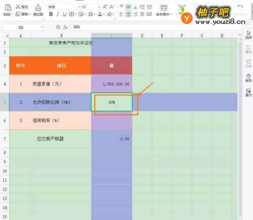 2选择单元格【C5】,根据房屋所在地的扣除标准,输入扣除【比例值】。