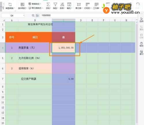 在Excel主界面,选择单元格【C4】,输入房屋【原值】。