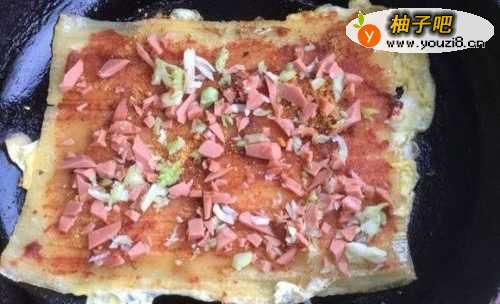 7然后把刚才切好的葱花碎和火腿丁一起倒上去,用铲子折起来,如图所示,再用刀切开就可以了