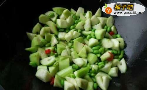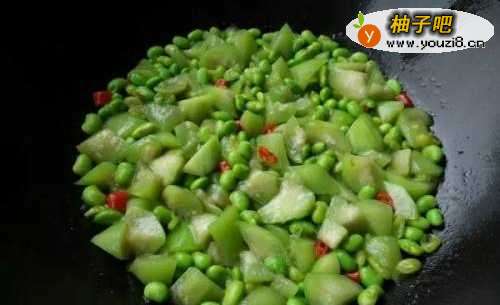 3等毛豆颜色变深,皮有点皱时可加入丝瓜一起翻炒