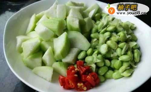 将丝瓜洗净去皮,滚刀切成小块;毛豆剥壳,辣椒切成小段