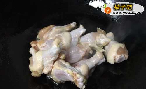 2接下来开火,锅烧热之后加入少许油,油烧热之后把洗干净的鸡腿倒进去翻炒,翻炒至及腿呈黄色即可。