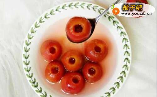 新鲜山楂果准备出适量,事先放入在盐水中浸泡半个小时,搓洗干净,用比较硬的吸管将山楂的核去掉。