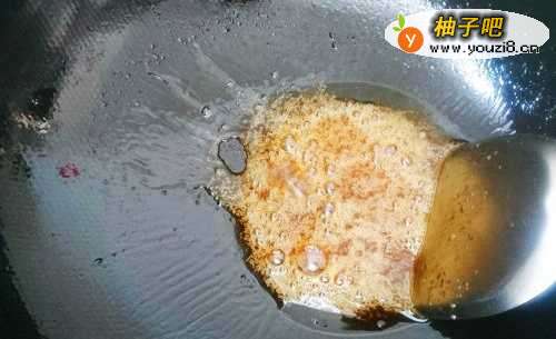 7接下来开始熬糖浆:开小火,锅内不用重新倒油,我们用刚才锅里残留的底油就可以了。将白砂糖倒进锅里,再加入3汤匙清水,并用铲子不断推动锅里的糖水。